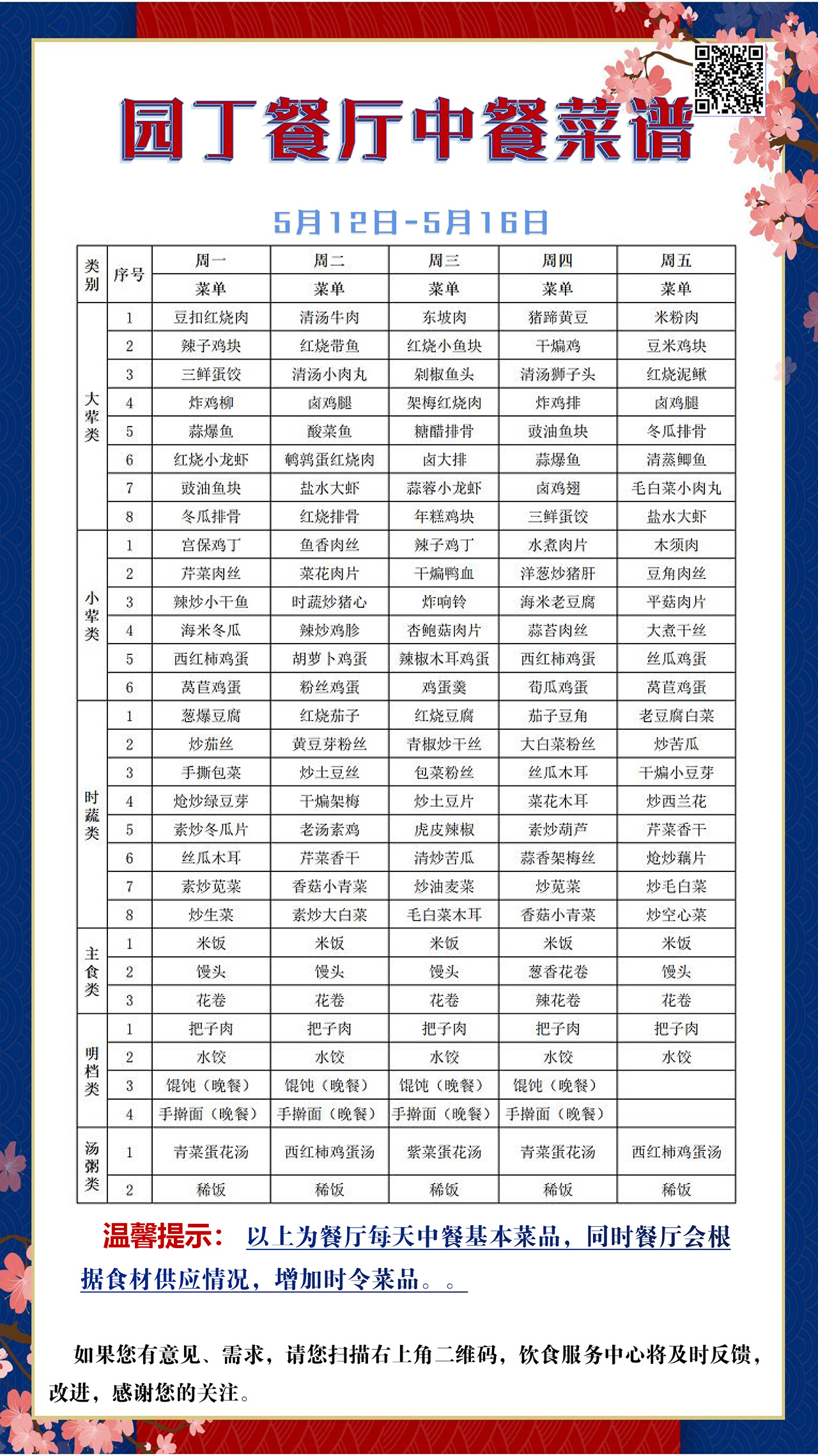 根据大数据分析,餐厅11:25-11:35、11:45-11:50、12:00-12:05三个时间段为就餐高峰期,为了减少排队等待时间,老师们可以选择错峰就餐。餐厅所有食材当天购买、当天使用,菜品新鲜,安全卫生。