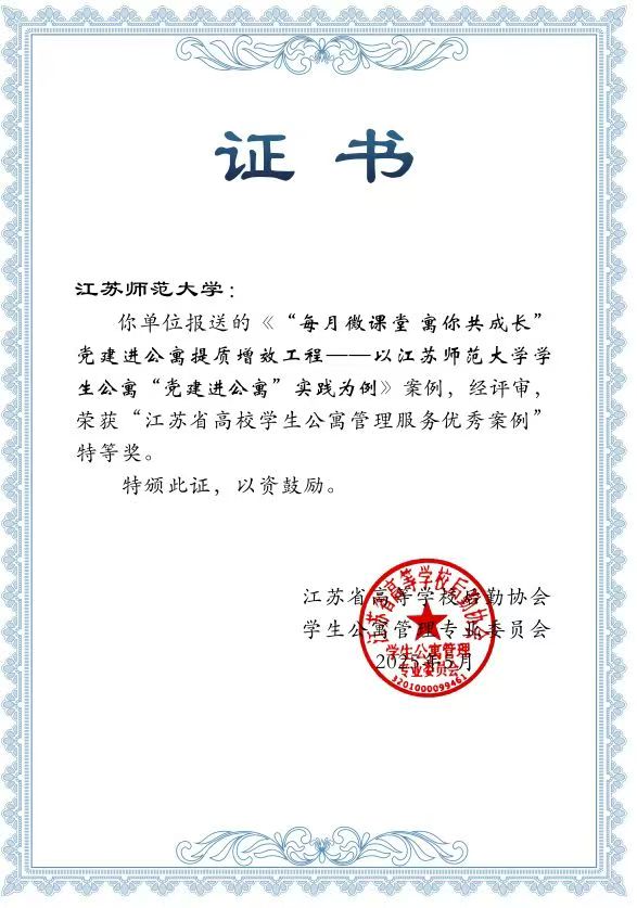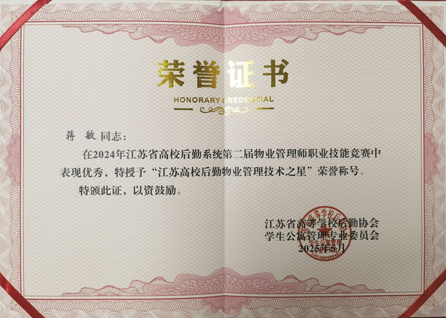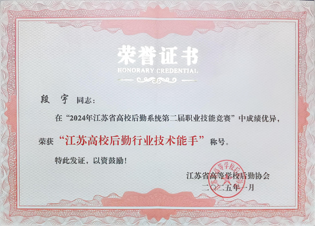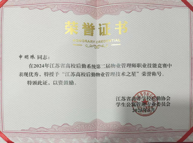 近日,从江苏省高校后勤协会学生公寓管理专业委员会2024年年会获悉,我校后勤保障部公寓服务中心报送的《“每月微课堂 寓你共成长”党建进公寓提质增效工程——以江苏师范大学学生公寓“党建进公寓”实践为例》案例,荣获特等奖;我校后勤保障部物业服务中心段宇在江苏高校后勤系统第二届职业技能竞赛中,成绩突出,荣获“江苏高校后勤行业技术能手”称号,公寓服务中心蒋敏、申明珠荣获“江苏高校后勤物业管理技术之星”称号。