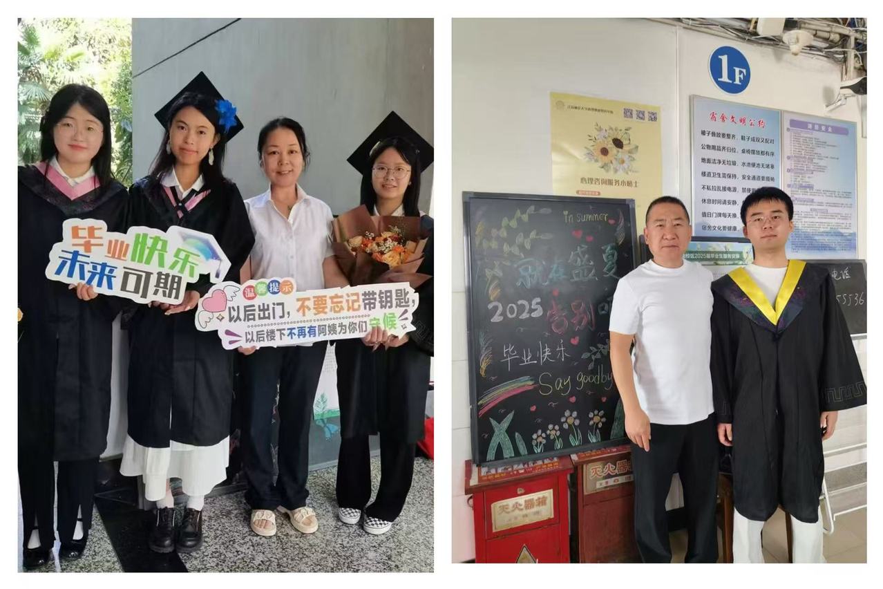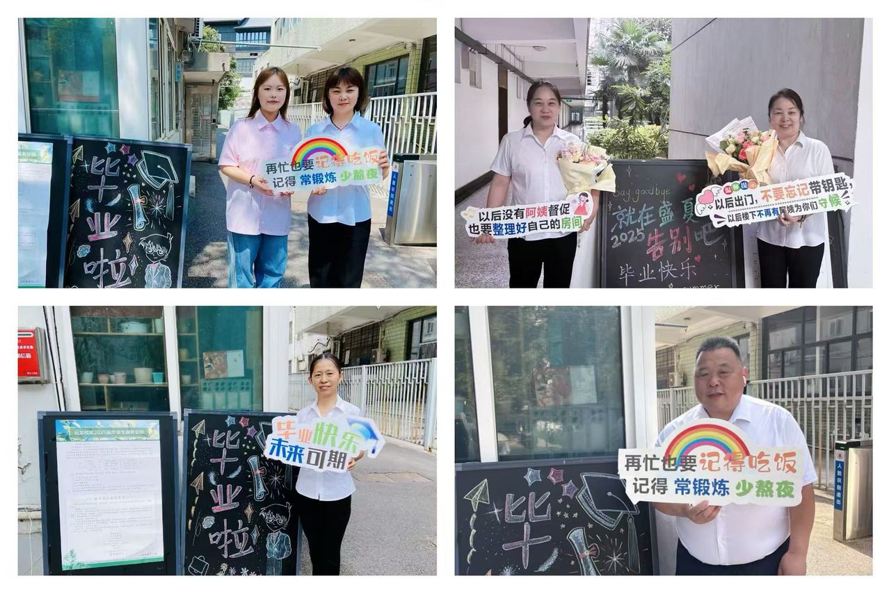 暖心相伴互道珍重四年的朝夕相处,1000多个日日夜夜守护,无论对违章用电的严厉批评,对生活难题的解疑答惑,还是对防火、防盗的叮咛…宿管人员和同学们互相理解、互相尊重,结下了深厚的感情。离别在即,同学们和宿管阿姨依依惜别,对她们的辛勤付出表示感谢。一个深情的拥抱,一张温馨的合影,一串温馨互动,一句简单的“谢谢”,让宿管阿姨、大叔们倍感欣慰,真切体会了“即使不同路,陪你走过一段也实属荣幸”。