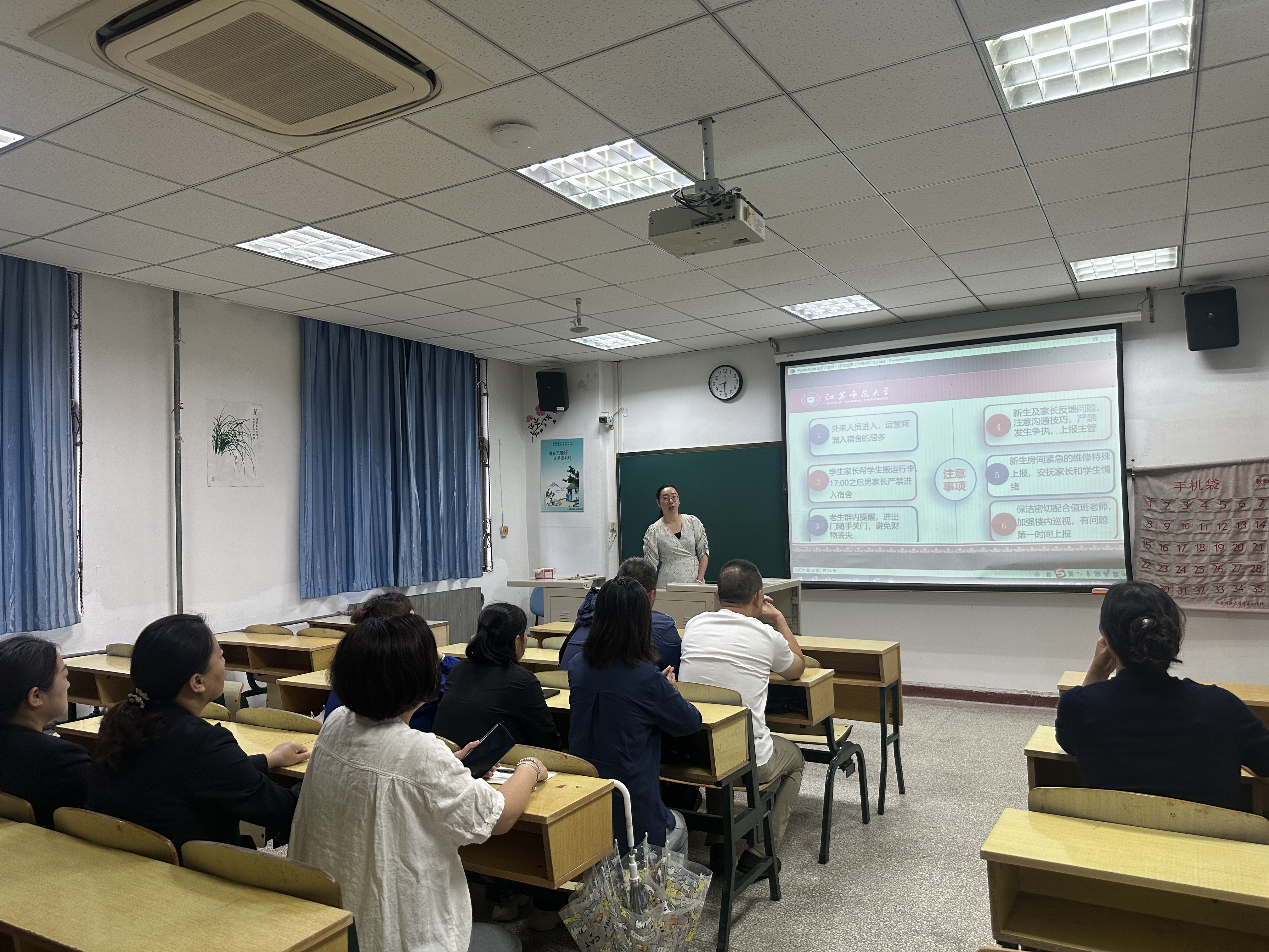 随后,中心主管赵洁围绕迎新工作的具体流程进行了系统培训。一是新生入校前的准备工作:详细梳理了宿舍分配、物资查验、环境布置等前置环节。二是报到日的现场接待,明确了注册登记、钥匙发放、引导答疑等各岗位操作规范。三是安全注意事项与应急处理,重点讲解了常见安全隐患的预防与突发事件处置流程。