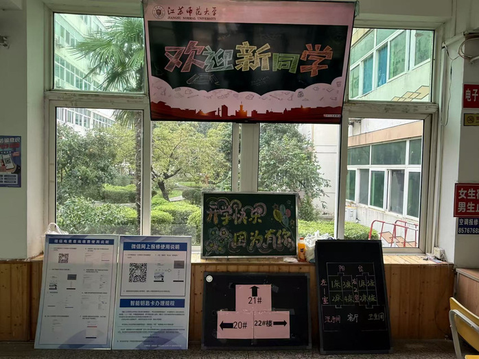 全心全意服务,营造温馨氛围。让新生感到家一般的温暖是公寓服务中心的一贯追求。迎新期间一块块诙谐的板书、组团大屏上投放的迎新照片、微笑的服务通过不同方式营造温馨的迎新氛围。报到现场,各楼工作人员组织学生有序报到,核对信息,登记签到,发放门卡,对宿舍设施使用和注意事项进行讲解,对学生和家长的疑问进行解答,现场一派热烈气象。朝夕转瞬即逝,随着夜幕降临,不断攀升的新生报到数字趋于稳定,两天的迎新工作也在大家的共同努力下划上圆满句号。