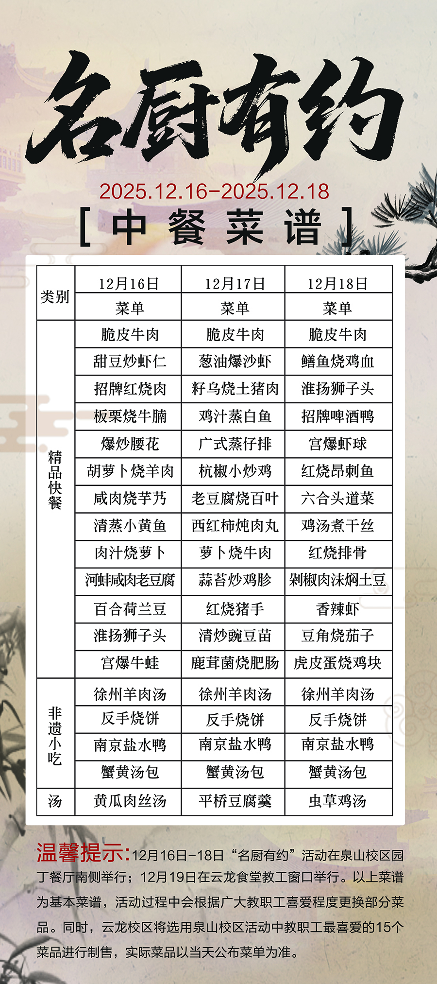 为进一步提升教职工就餐体验,丰富日常就餐选择,后勤保障部饮食服务中心在总结往期活动经验的基础上,持续推出第五期“名厨有约”活动。本期活动由泉山七食堂(南京军歌餐饮管理有限公司)承办,特邀多位资深大厨现场制作,以精湛技艺呈现风味佳肴。基于广大教职工的热切期盼与宝贵建议,本期将继续保留上期备受好评的羊肉汤、反手烧饼等菜品,并在口味与服务上进行优化升级,力求在传承中创新,在服务中提升。