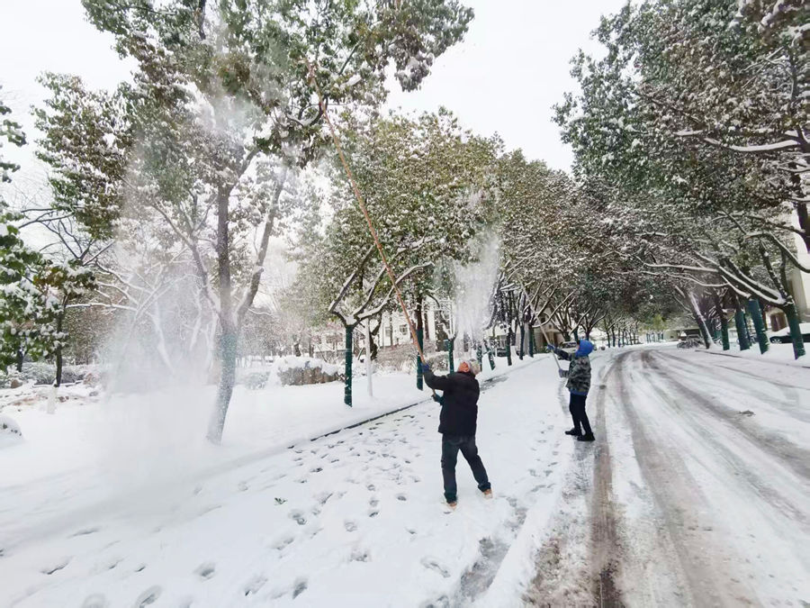 降雪伊始,物业服务中心便通过气象局发布的实时信息跟踪雪情,提前完成除雪工具检修、融雪剂储备、人员分工部署及主要路段放置石子防滑等准备工作。雪情加重后,各小组迅速集结,按照“先主路、后支路,先教学区、后生活区,先桥梁陡坡、后平坦区域”的原则,分区域、分时段推进除雪工作。他们手持铁锹、除雪铲等工具,默契配合清理路面积雪。绿化队拉着融雪剂穿梭于校园各处桥面和陡坡铺设融雪剂,防止路面结冰。与此同时还不忘分出人手及时处理树上积雪以免压断树枝。寒风吹红了脸颊,汗水浸湿了衣衫,但全体人员始终坚守岗位,不顾严寒持续奋战,用忙碌的身影勾勒出校园里最温暖的风景线。下一步,物业服务中心将持续关注天气变化,加强校园巡查力度,做好后续防冻防滑工作,为广大师生营造安全、舒适、有序的校园氛围。