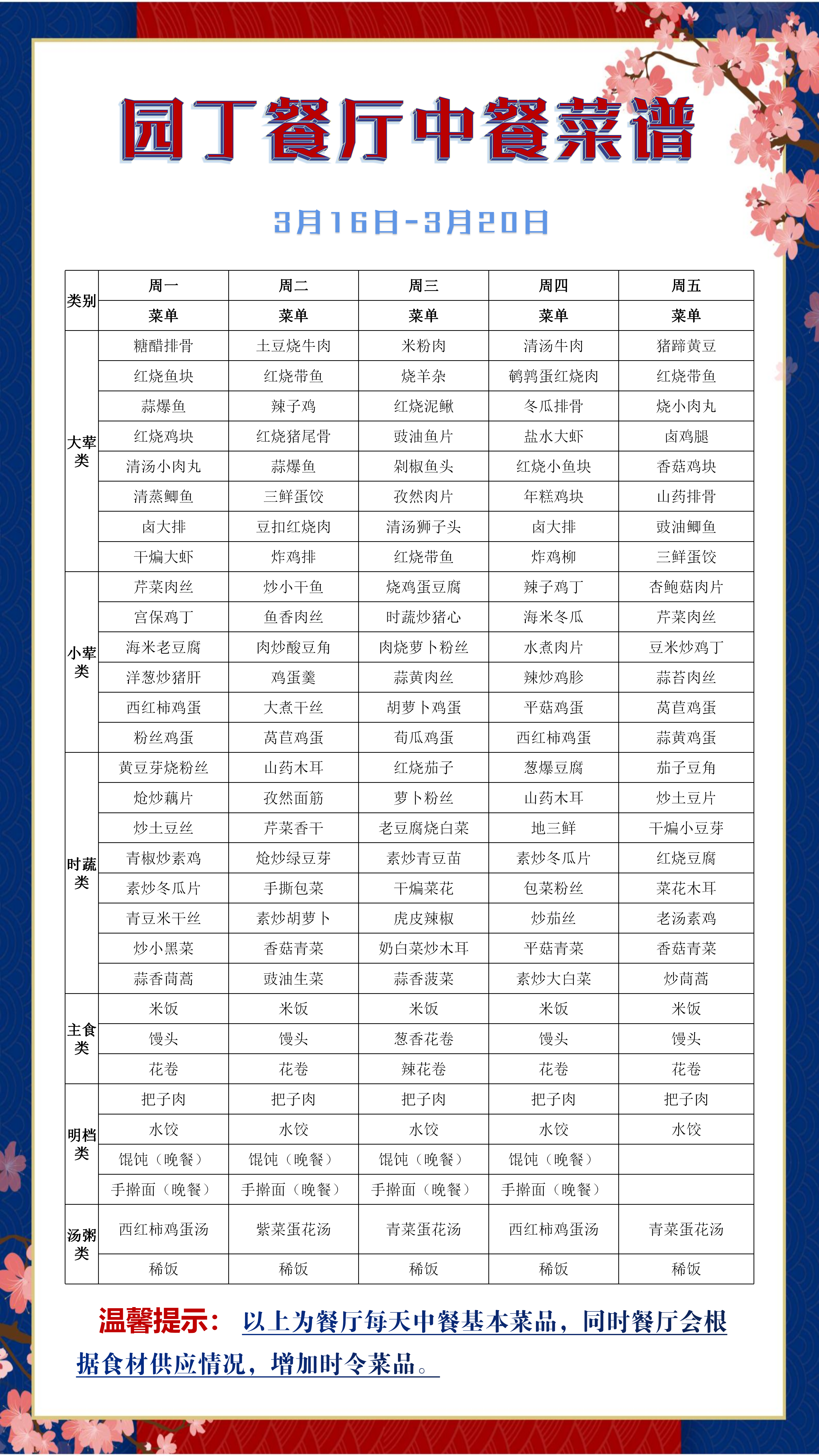 园丁餐厅周菜谱(3月16日-3月20日)