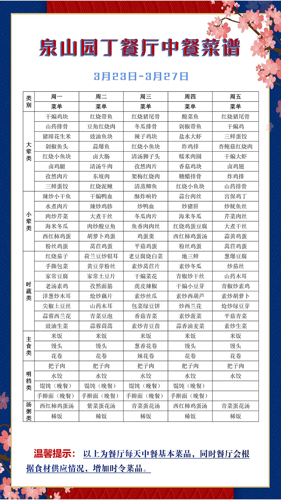 泉山园丁餐厅、云龙教工窗口中餐菜谱(3月23日-3月27日)