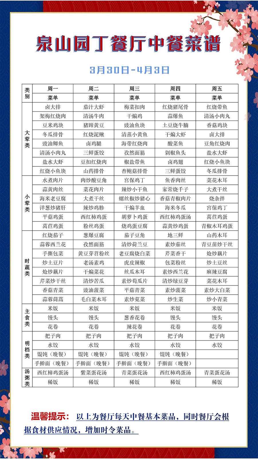 泉山园丁餐厅、云龙教工窗口中餐菜谱(3月30日-4月3日)